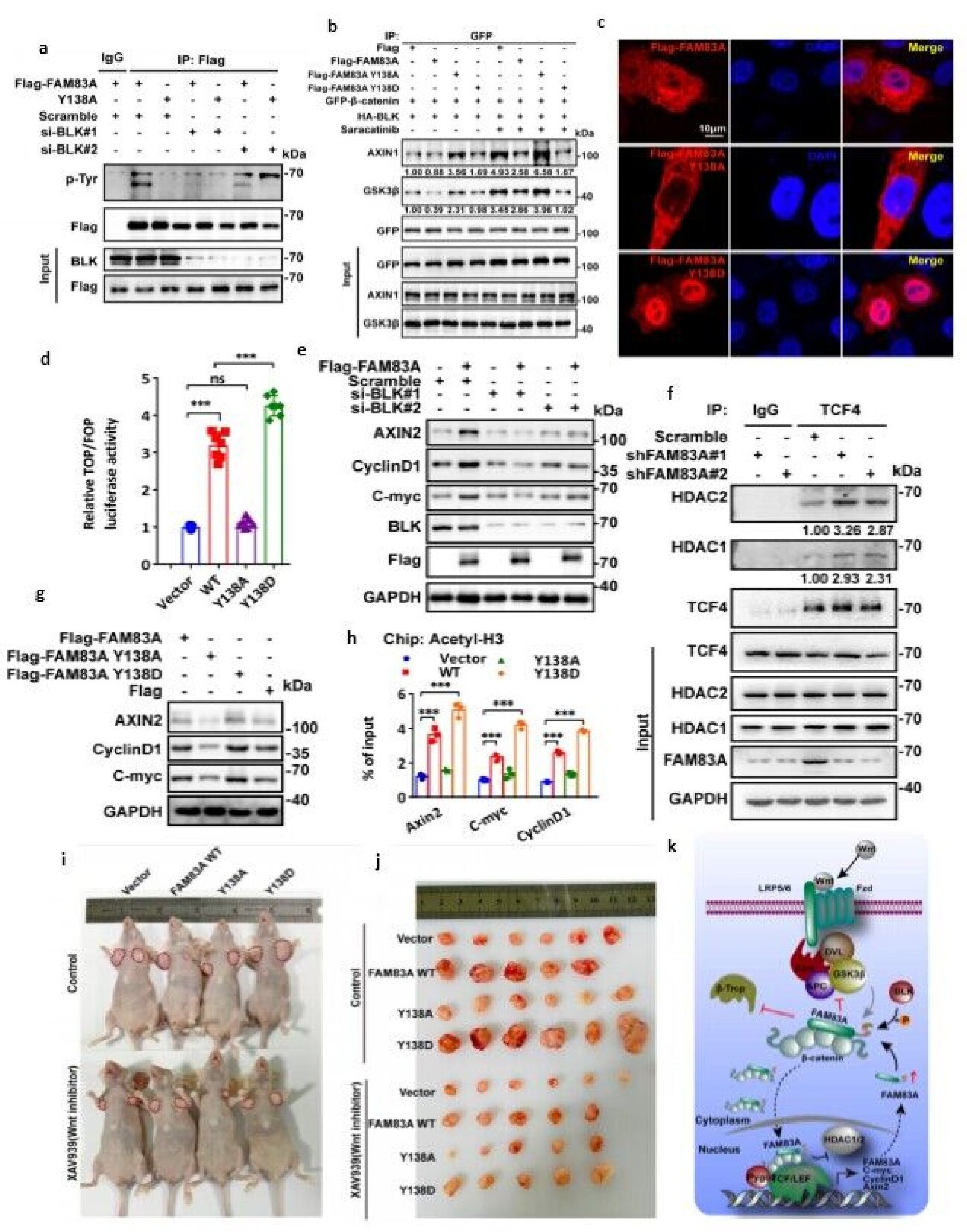 图2.BLK磷酸化FAM83A Y138残基,磷酸化的FAM83A抑制β-连环蛋白破坏复合体组装和TCF4对HDAC的招募。