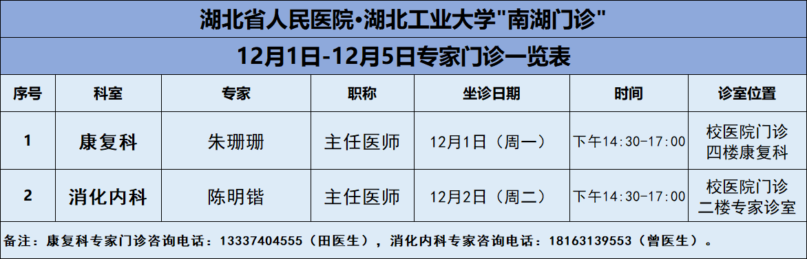 12月1日-12月5日,湖北工业大学医院将邀请湖北省人民医院知名专家——康复科朱珊珊主任、消化内科陈明锴主任两位专家教授前来校医院坐诊(具体坐诊信息见下),请广大师生、周边居民持续关注南湖门诊专家坐诊信息,如有: