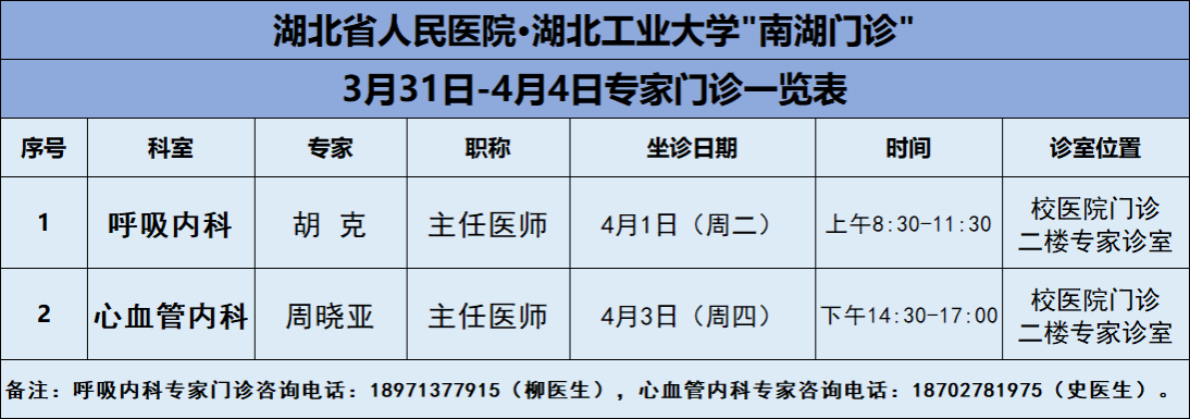 3月31日-4月4日,校医院将邀请湖北省人民医院知名专家——呼吸内科胡克主任、心血管内科周晓亚主任两位专家教授前来校医院坐诊(具体坐诊信息见下),请广大师生、周边居民持续关注南湖门诊专家坐诊信息,如有