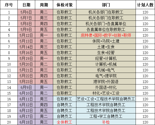 校医院定于2025年5月6日—6月18日(工作日上午)期间对全校在职教工体检。为了保证体检质量及体检结果的准确性和权威性,特聘请武汉大学爱尔眼科医院眼科专家及中南医院内科、外科、耳鼻喉科、B超等专家与校医院共同完成。请各单位接到通知后,提前告知本单位员工积极按时间段参加体检(详见附件),具体安排如下: