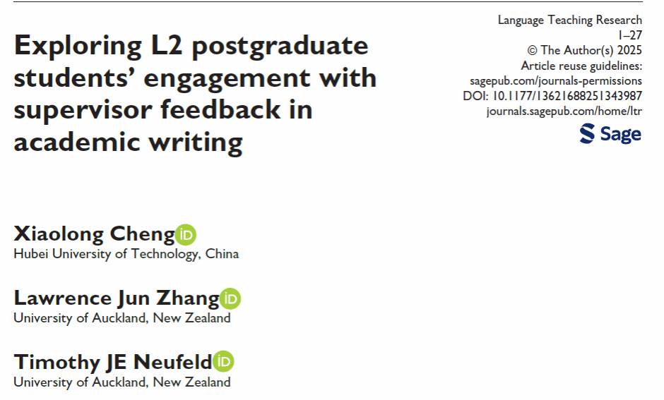 近日,外国语学院青年教师程晓龙副教授与我校客座教授、新西兰奥克兰大学文学与教育学院Lawrence Jun Zhang教授以及Timothy Neufeld博士合作,在国际语言学顶刊《Language Teaching Research》(SSCI收录,中科院一区Top期刊)发表题为“Exploring L2 postgraduate students’ engagement with supervisor feedback in academic writing”的重要研究成果。湖北工业大学为该论文的第一完成单位,程晓龙副教授为论文的第一作者与通讯作者。