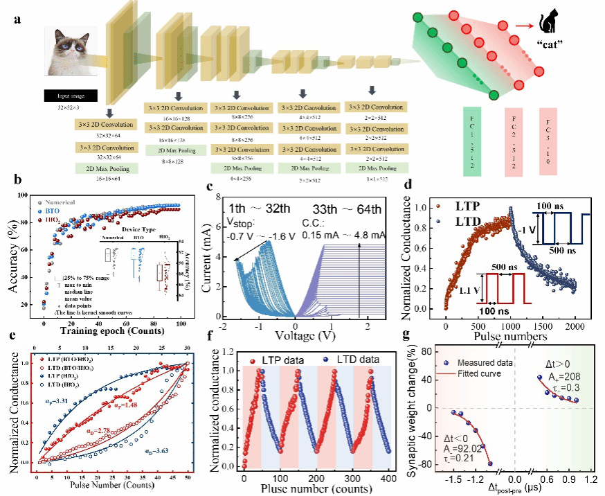 Jeongmin Hong教授团队在这项工作中展示了一种基于Pt/BaTiO₃(BTO)/HfO₂/TiN结构的超高灵敏度跨模态伤害感知系统。该器件能够检测并处理触觉和视觉刺激中的微小变化。其优异性能主要归功于在HfO₂功能层内引入了BTO中间层。BTO层中丰富的氧空位能够精确控制BTO/HfO₂忆阻器中导电丝的形成和断裂,从而使器件表现出具有超高灵敏度的伤害感受器特性。它展示了阈值响应、无适应性、弛豫和增敏等关键特征,即使刺激有轻微增加也能触发显著的响应。此外,将BTO/HfO₂传感器集成到一个跨模态系统中还能够模拟视觉、触觉和痛觉感知,凸显了其在先进人机交互应用中的潜力。