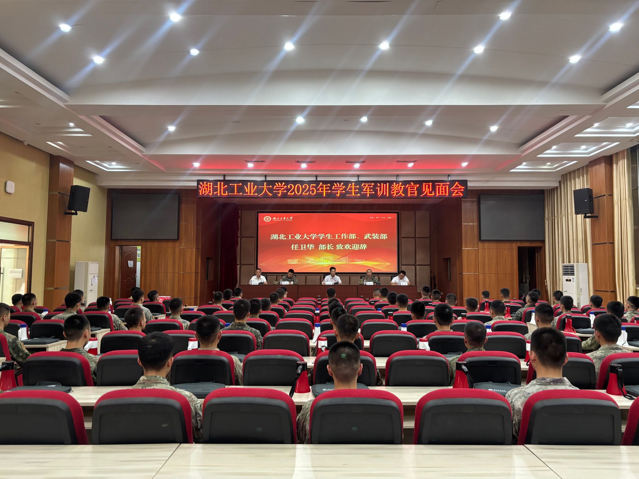 10月8日下午,学生工作部、武装部在博学堂举行2025年学生军训教官见面会,全体承训教官、连队指导员齐聚一堂,共同研讨部署学生军训工作。