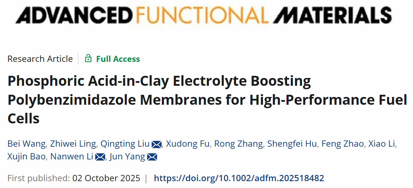 近日,湖北工业大学材料与化学工程学院氢能领域科研团队在国际顶级期刊《Advanced Functional Materials》(自然指数期刊,一区Top期刊,影响因子19)上发表题为“Phosphoric Acid-in-Clay Electrolyte Boosting Polybenzimidazole Membranes for High-Performance Fuel Cells”的研究论文。材化学院硕士研究生王贝为第一作者,材化学院刘清亭教授、深圳理工大学李南文教授以及株洲时代新材料科技股份有限公司杨军为共同通讯作者,我校为论文第一单位。