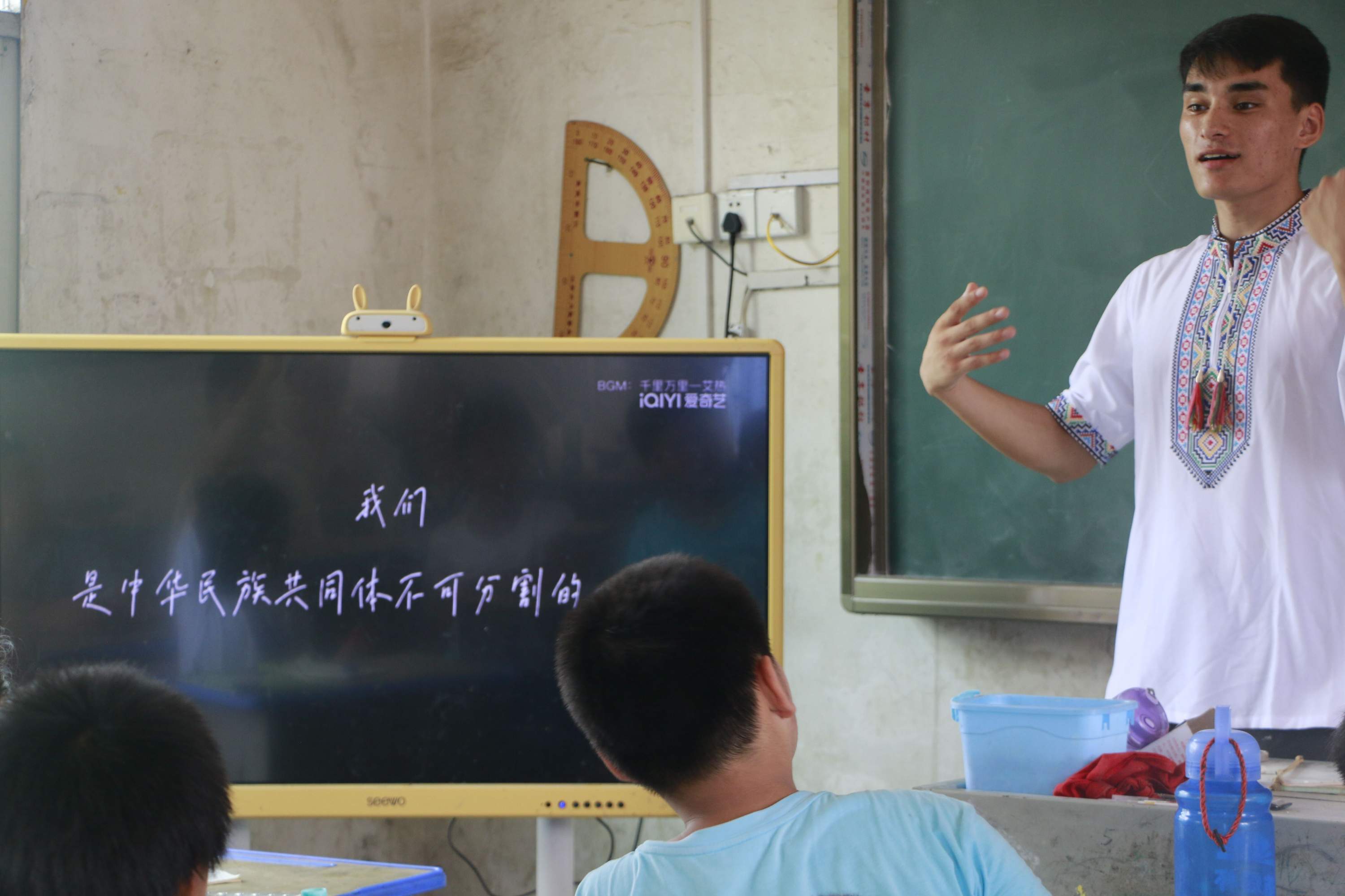 湖北黄冈乡村小学的课堂上,孩子们围着一位高鼻梁、深眼眶的青年好奇。青年笑着用流利的普通话说:“我叫热依木,来自新疆喀什,我们和大家一样,都是中华民族大家庭的一员。”