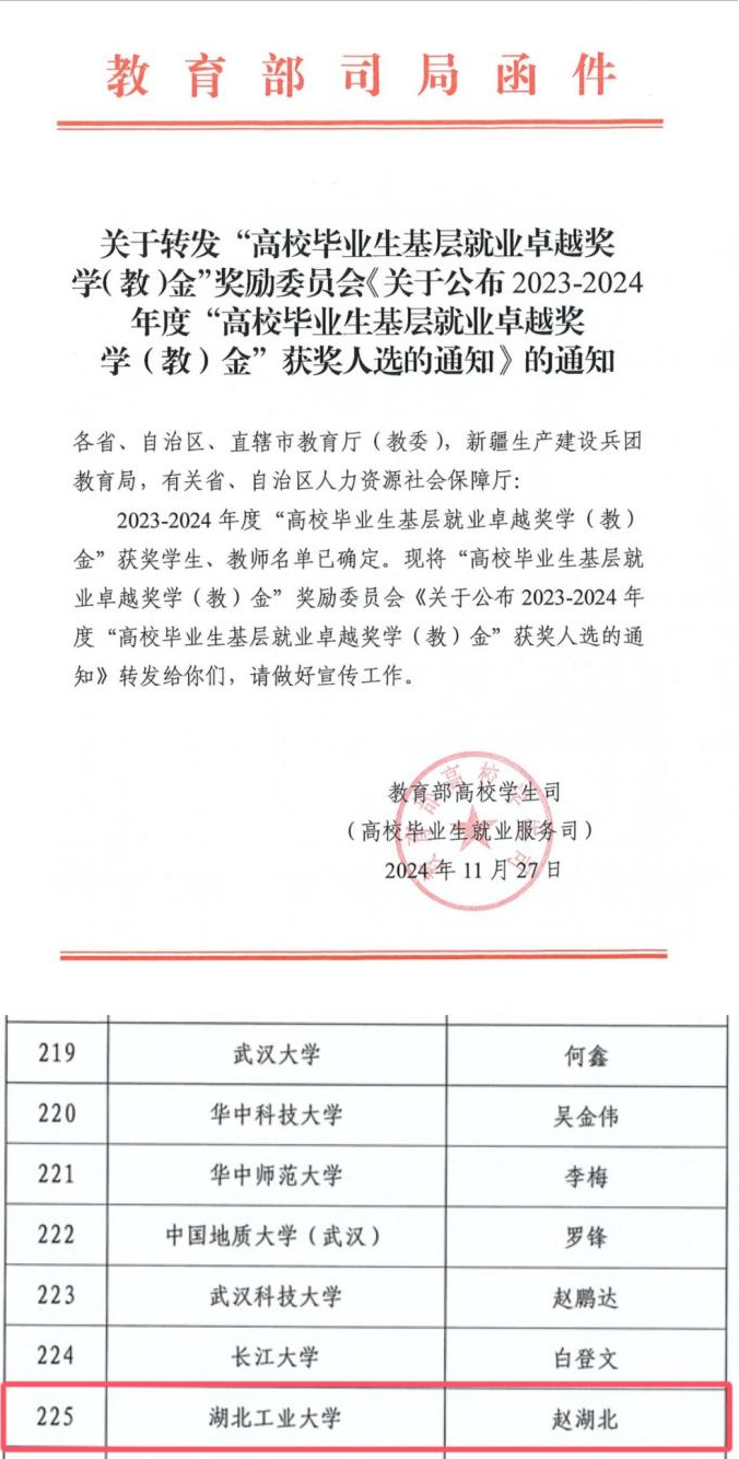 近日,“高校毕业生基层就业卓越奖学(教)金”2023-2024年度获奖人选名单公布,赵湖北获此殊荣,成为我校首位获得该项国家级荣誉称号的毕业生。该奖项由教育部高校学生司(高校毕业生就业服务司)与教育部学生服务与素质发展中心共同指导、中国教育发展基金会设立,旨在深入贯彻落实党中央、国务院关于引导和鼓励高校毕业生到基层就业的决策部署,奖励赴基层就业并做出突出业绩的普通高校毕业生和普通高校指导服务大学生赴基层就业工作有突出贡献的教师。