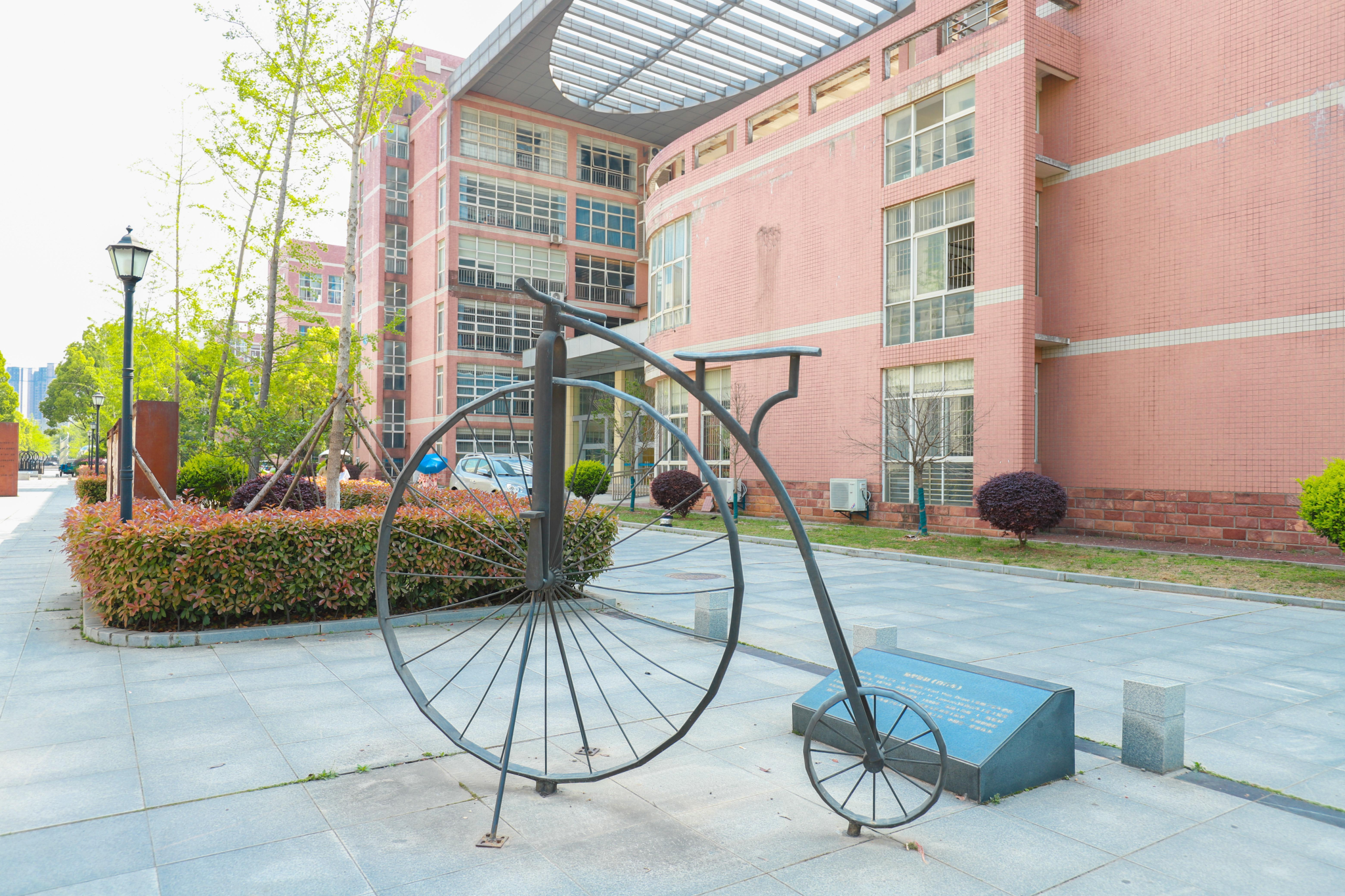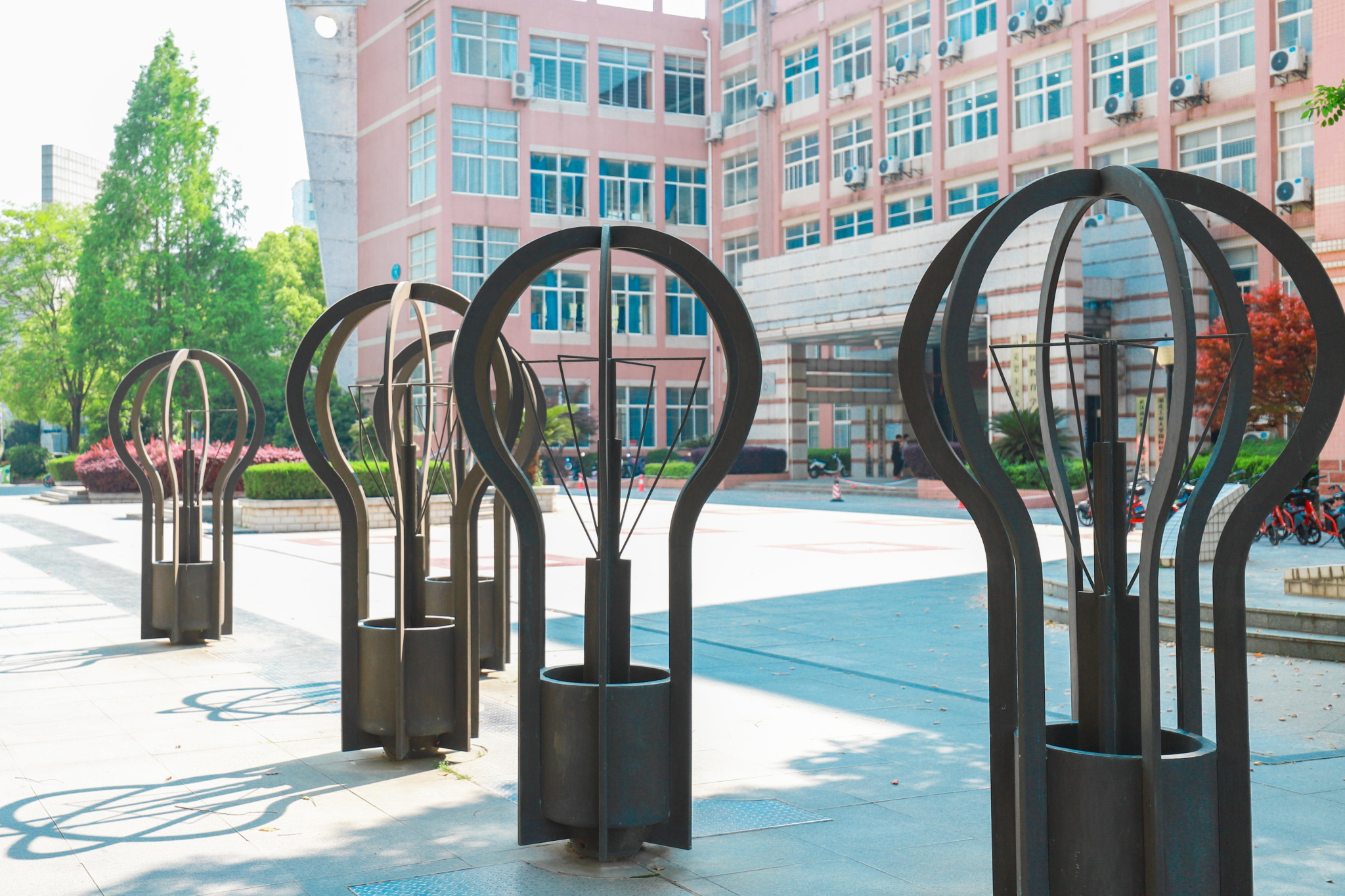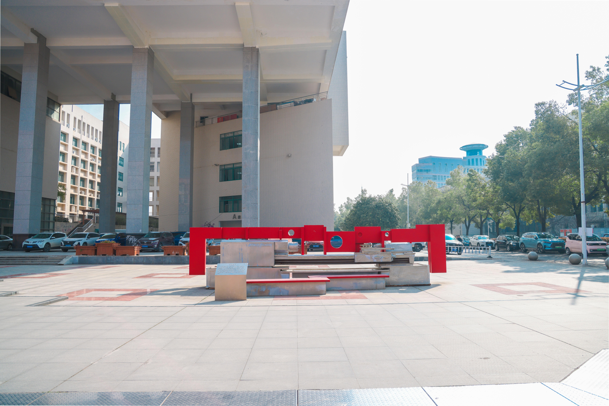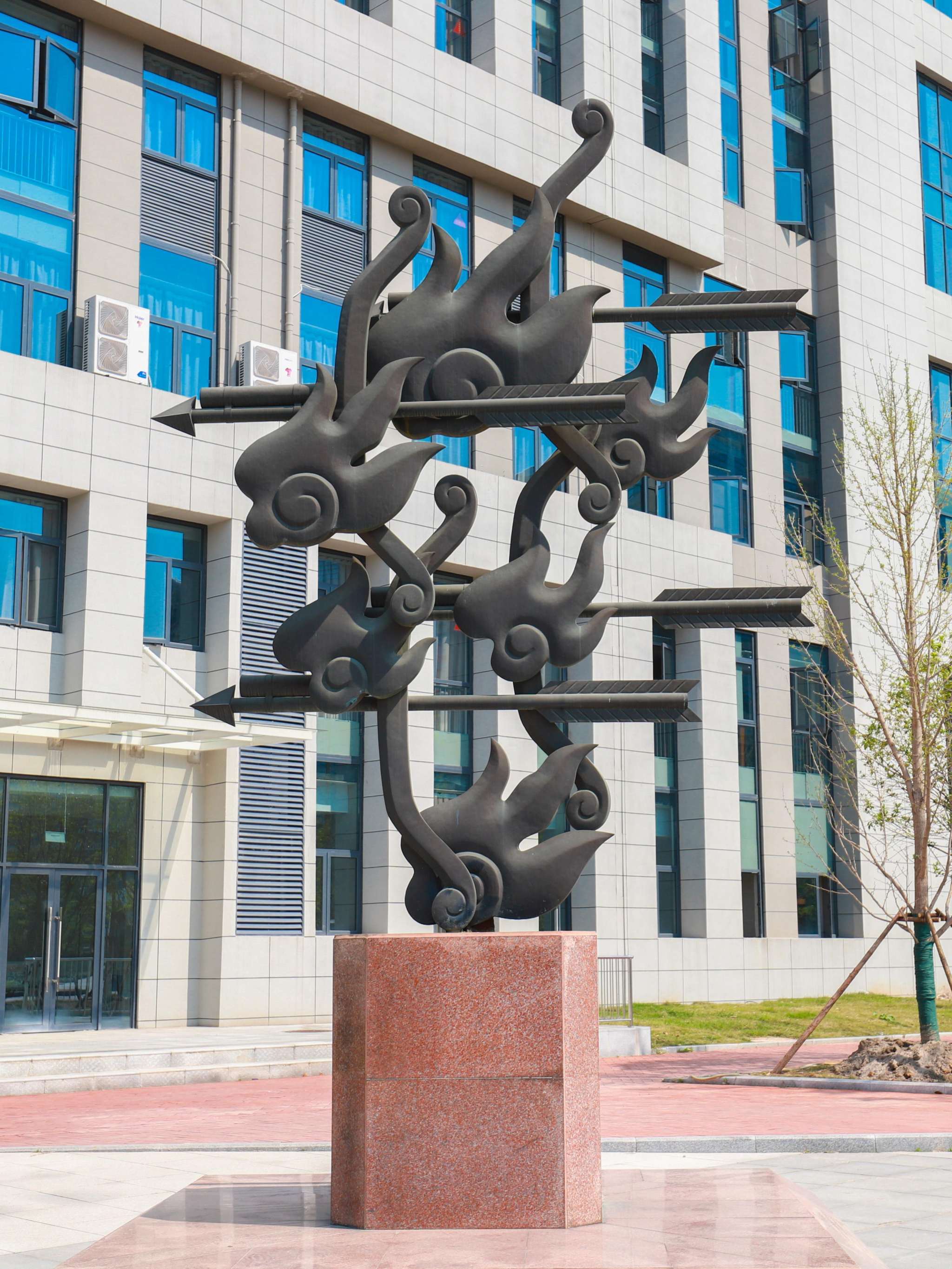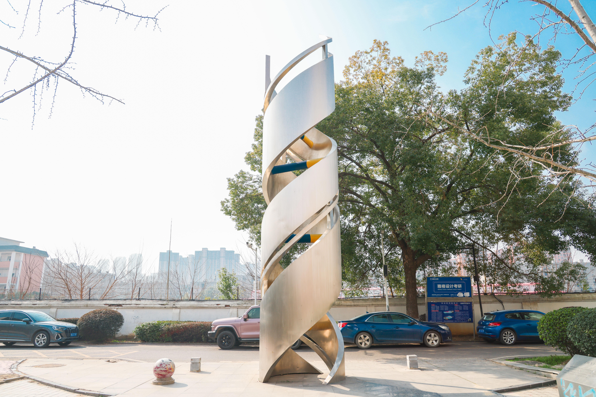 地面钢板折起组成蓬勃向上的抽象雕塑,与生物遗传的DNA抽象形态十分相似,整体也以螺旋上升形态组合。它矗立在校园里,高耸入云,象征着精神飞扬,寓意工业文化长廊有终点,工业发展无止境。激励莘莘学子勇担工业报国的使命,传承科学创新精神,为中国工业的腾飞贡献自己的力量。