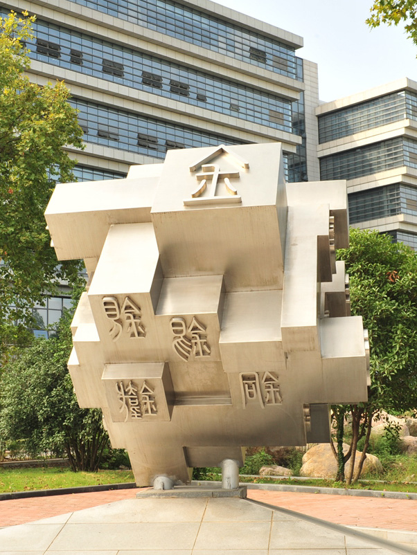 活字印刷术雕像,高2.8米,主体为不锈钢锻打而成,地面铺设石材。